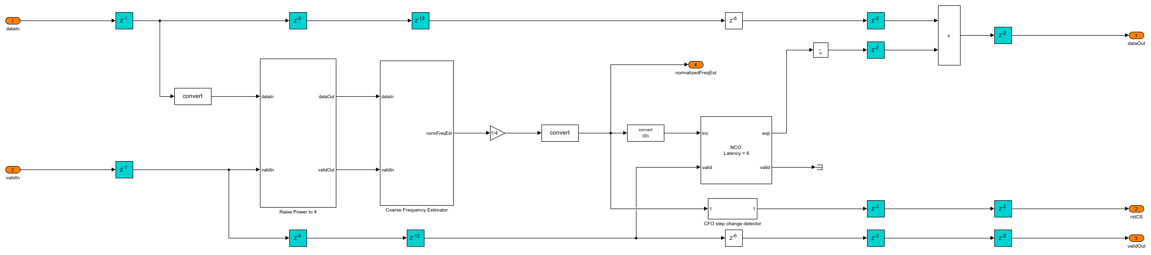 The Coarse Frequency Compensator subsystem raises the input sequence to a power of 4 in the Raise Power to 4 subsystem. This eliminates the QPSK phase mapping dependency in the input sequence but reduces the estimation range by a factor of 4. This sequence streams into the Coarse Frequency Estimator subsystem. The estimate obtained from the Coarse Frequency Estimator subsystem is divided by 4 to remove the factor 4 due to raising to power 4 and get the normalized coarse frequency estimate. This estimate drives the NCO (DSP HDL Toolbox) block to generate complex exponential phase that is conjugated and multiplied with the input sequence to correct the frequency offset.
