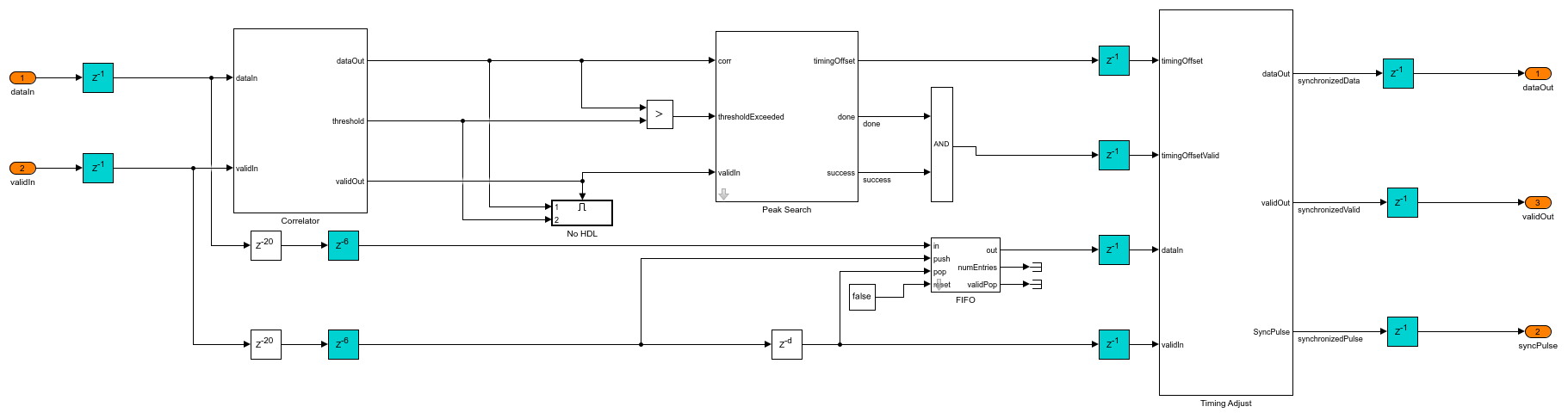 The Preamble Detector subsystem performs continuous correlation for the input with the Barker sequence. The correlation is implemented as convolution with the reversed Barker sequence as coefficients for the Discrete FIR Filter (DSP HDL Toolbox) block, and the magnitude of the correlated output is found using the Complex to Magnitude-Angle (DSP HDL Toolbox) block inside the Correlator subsystem. The magnitude of the correlation is compared with a threshold. The Peak Search subsystem begins searching for the maximum correlation peak that exceeded the threshold for every one frame duration and records the timing offset. The Timing Adjust subsystem synchronizes packet timing based on the timing offset to generate syncPulse signal, which indicates a packet synchronized sample to the subsequent subsystem.