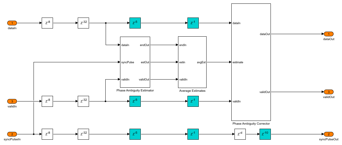 The Phase Ambiguity Estimation and Correction subsystem works based on the unique word method for phase ambiguity resolution described in Chapter 7.7.1 of [ 1 ]. This method uses the preamble sequence as the reference sequence. The reference sequence is conjugated and multiplied with the preamble sequence in the input, and the residual phase is extracted as the phase ambiguity estimate. This estimate is used to correct the ambiguity by rotating the constellation in the opposite direction of ambiguity.