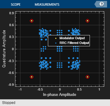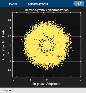 This section explains the specifications of the transmitter and receiver used in this example. The transmitter uses a packet-based frame format. To generate a preamble sequence, each bit of the 13-bit Barker sequence is repeated twice such that the same bit is modulated in the in-phase and quadrature-phase by the QPSK Modulator. The preamble sequence is followed by 2240 bits of payload data. The transmitter runs using a root raised cosine (RRC) pulse-shaping filter with a roll-off factor of 0.5, resulting in a bandwidth of 1.5 times the symbol rate. It uses four samples per symbol, resulting in a sample rate of four times the symbol rate. The RRC impulse response spans over four adjacent symbols. The bit rate is twice the symbol rate. The effective average bit rate is the bit rate times the frame efficiency. The frame efficiency is (2240/(2240+26)) , which equals to 0.9885.