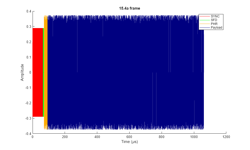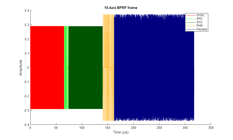 msg = randi([0 1],800,1); cfg4a = lrwpanHRPConfig( ... Mode='802.15.4a', ... MeanPRF=15.6, ... Channel=3, ... CodeIndex=6, ... PSDULength=length(msg)/8) %#ok<NOPTS> wave4a = lrwpanWaveformGenerator(msg,cfg4a); lrwpanPlotFrame(wave4a,cfg4a);