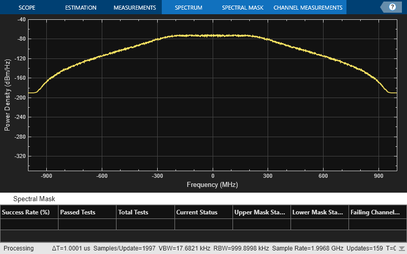 The IEEE 802.15.4 standard specifies a mask for the transmit power spectral density PSD (see Sec. 15.4.5 in [ 1 ]). The lrwpanHRPTxPSDMask helper function displays the spectral density of the generated waveform and examines the conformance to the spectral mask.