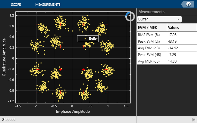 A constellation diagram after the receive filter, with error vector magnitude (EVM) calculation turned on