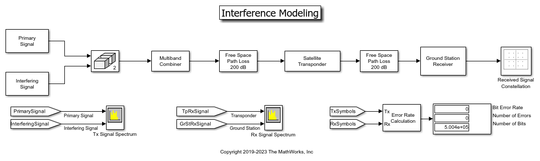 The InterferenceModelingExample model simulates a bent pipe satellite communication link and illustrates how to model an uplink interference scenario. A bent pipe link consists of an uplink from a ground station to a satellite, which acts as a repeater, and downlinks to another ground station without performing any bit-level processing. The satellite transponder receives a primary signal and an interfering signal from a secondary ground station. The combined signal is re-broadcast by the satellite, received and processed at the ground station.
