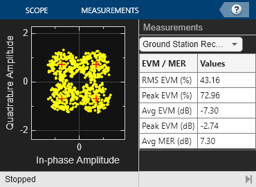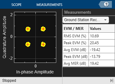 A bit error rate of 0 shows that the system performance is not degraded by this amount of interference. Also, the Received Signal Constellation at the ground station receiver is well clustered around the reference QPSK constellation of the primary signal with a low RMS EVM.