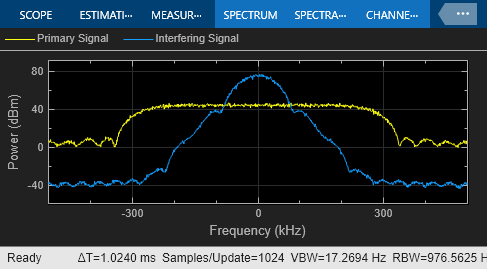 A Multiband Combiner block provides an efficient approach to combine the primary and the interfering signals at baseband. The Multiband Combiner block interpolates the two signals so that the resulting sample rate of the signals guarantees no aliasing when the signals are frequency shifted to model the interference scenario. Then it applies the specified frequency shifts to the signals and combines them into one signal. The block allows modeling of various amounts of spectral overlap to simulate varying severity of interference. For more information, see the Multiband Combiner block reference page.