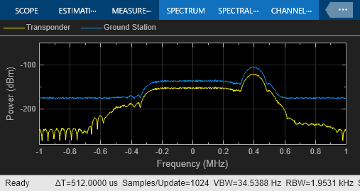 Each of the two baseband signals has a bandwidth of 500 kHz as seen in the Tx Signal Spectrum scope. The Frequency offsets parameter of the Multiband Combiner block is set up to model spectral overlap of 100 kHz. This spectral overlap is seen in the Rx Signal Spectrum that shows the spectra of the signals received at the satellite transponder and ground station receiver.