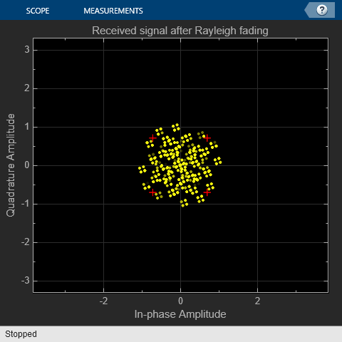 By opening the constellation diagram following the Rayleigh channel block, you can see the impact of wideband fading on the signal constellation. To slow down the channel dynamics for visualization purposes, we reduce the maximum Doppler shift to 5 Hz. Compared with the QPSK channel input signal, you can observe obvious distortion in the channel output signal, due to the ISI from the time dispersion of the wideband signal.