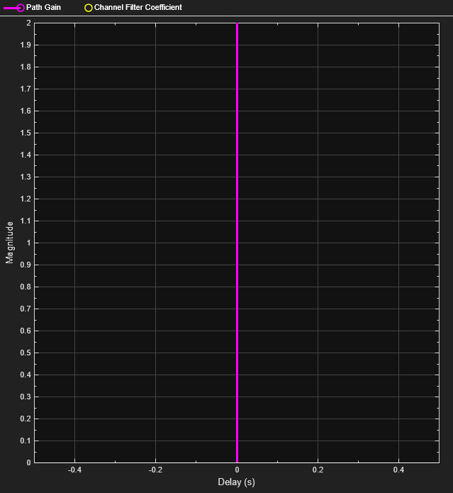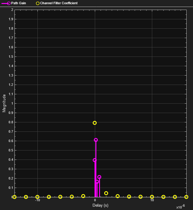 Setting the Channel visualization parameter of the channel block to 'Impulse response' shows the bandlimited impulse response (yellow circles). The visualization also shows the delays and magnitudes of the underlying fading path gains (pink stems) clustered around the peak of the impulse response. Note that the path gains do not equal the Average path gains (dB) parameter value because the Doppler effect causes the gains to fluctuate over time.