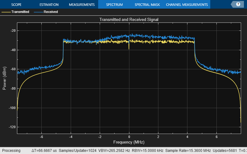 Use the spectrumAnalyzer function to visualize the received spectrum after fading and noise are added to the transmitted signal. As the simulation runs, you can see how the received signal constellation is negatively affected by the spectral nulls caused by multipath fading.