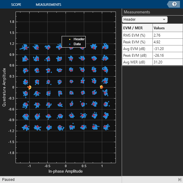 Use the comm.ConstellationDiagram object to display the header constellation and data constellation in one plot. By varying the channel impairments, you can visualize the noise after receiver impairment compensation for all subcarriers superimposed on the plot. EVM and MER can be measured with respect to the reference constellation for each data modulation.