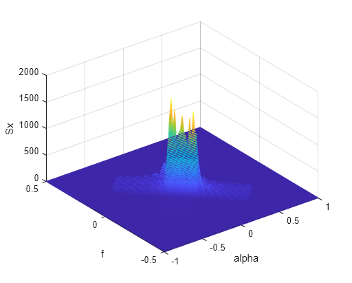 Run the plot function commP25plot.m. This step illustrates the spectral autocorrelation function, which is a three-dimensional figure. Its x-axis represents the cyclic frequency (alpha) from -1 to 1. Its y-axis represents the spectral frequency (f) from -0.5 to 0.5, and its z-axis (Sx) represents the corresponding magnitude of the spectral autocorrelation function for each (alpha , f) pair. Cyclic resolution dalpha = 1/T, where T is the observation time of the data. Spectral resolution df = 1/Tw, where Tw is the window time to calculate the complex demodulate [ 7 ]. Since T > Tw, dalpha < df. Note that when alpha does not equal zero, the SAF values are approximately zero.