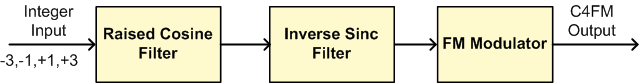 A normal raised cosine filter, which satisfies the Nyquist pulse shaping criterion, minimizes intersymbol interference. The parameters of the raised cosine filter are chosen per the filter's specifications in [ 8 ]. Specifically, this raised cosine filter has an upsampling factor of 4, and a roll-off factor of 0.2. The C4FM standard also calls for an inverse sinc filter after the raised cosine filter, to compensate for the sinc response of a P25 receiver integrate and dump filter. The FM modulator has a deviation of 600 Hz.