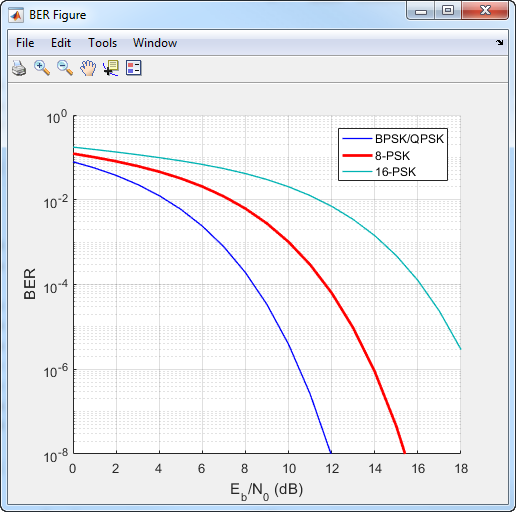 For modulation orders beyond 4, the bit error rate performance of PSK in AWGN worsens. In this bit error rate plot for Gray-coded mapping, the QPSK and BPSK curves overlap one another.