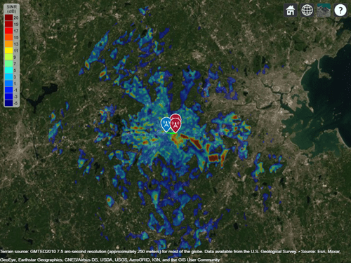 Display the coverage map of the transmitter. A coverage map visualizes the service area of the transmitter, which is where the received signal strength for a reference receiver meets its sensitivity. You can create coverage maps that depict signal strength as either a power quantity (typically dBm) or a voltage quantity (typically dBμV/m).