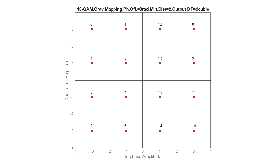 When you click View Constellation on the modulator block mask, the constellation diagram opens in a MATLAB® figure window. The title of the plot indicates the values of significant parameters.
