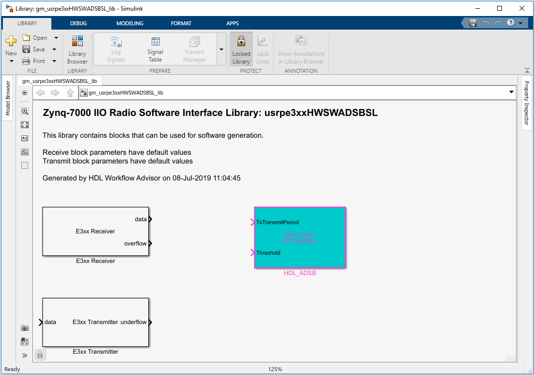 The library contains the AXI Interface block which has been generated from the HDL_ADSB subsystem. Note that this exposes only the AXI4-lite control ports, and not the data ports. The data ports are present on the Receiver/Transmitter blocks which represent the data interface between the FPGA user logic and the ARM. If you use the library blocks in your downstream models, any updates you make to your HDL subsystem will automatically be propagated to this library and then to your software generation models when you run through the workflow. In this example, the hardware generation model did not contain any SDR transmit or receive blocks so the parameters on these blocks could not be populated. When using the library blocks you must ensure to configure the parameters correctly for your application.