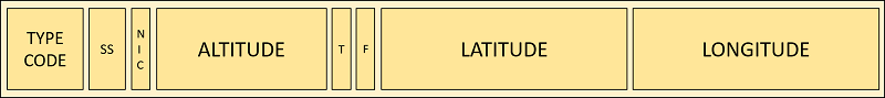 The content of an ADS-B message is identified through its Type Code (TC), which is the first 5 bits of the message. Depending on the type code, an ADS-B message can contain information about the aircraft ID (TC=4), airborne position in terms of altitude, latitude and longitude (TC=9), and horizontal and vertical velocity (TC=19). This example is specifically concerned with the decoding of airborne position messages, which are structured as shown in the diagram below.