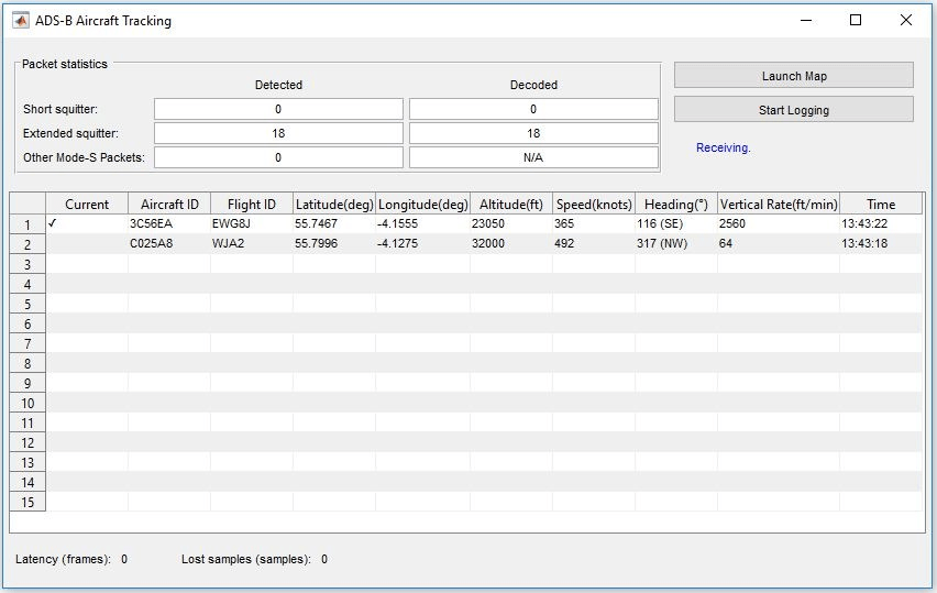 Additionally, if you have a valid license for the Mapping Toolbox™, you can observe the planes on a map. The recorded waveform that comes with this example contains eight captured ADS-B extended squitter messages of two different flights. For each flight there are two airborne position (TC=9), 1 aircraft ID (TC=4) and 1 vertical velocity (TC=19) messages that are repeatedly transmitted at a rate regulated by the TxTransmitPeriod control port.
