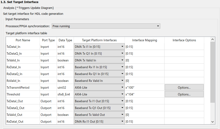 Note that the Transmitter block still has a data input. Even though no data is being sent from the ARM to the FPGA, this block is required to initialize the required RF parameters and to enable the transmit data path, therefore it must be included in the interface model.