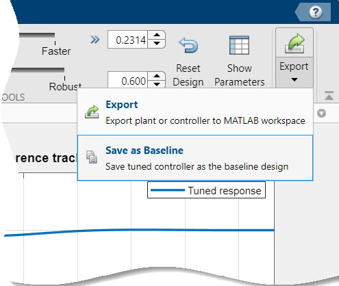 pidTuner(sys,C0).Make the current PID Tuner design the baseline controller at any time, by clicking the Export arrow
