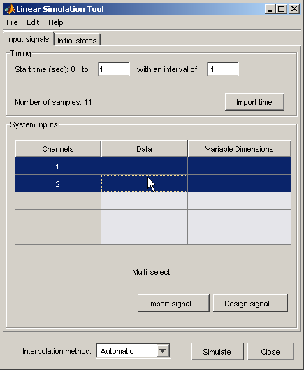 1. In the Linear Simulation Tool, click the Input signals tab (if it is not displayed).
