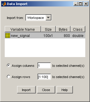 5. In the Data Import dialog box, click, Assign columns to assign the first column of the input signal to the selected channel.