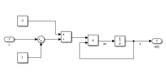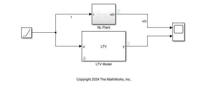 This example shows how to simulate a linear time-varying (LTV) model using the LTV System block. The LTV System block interpolates a state-space array to model the LTV response. In this example, you batch linearize the model defined by the following equation at time snapshots to obtain the array of linear state-space models.