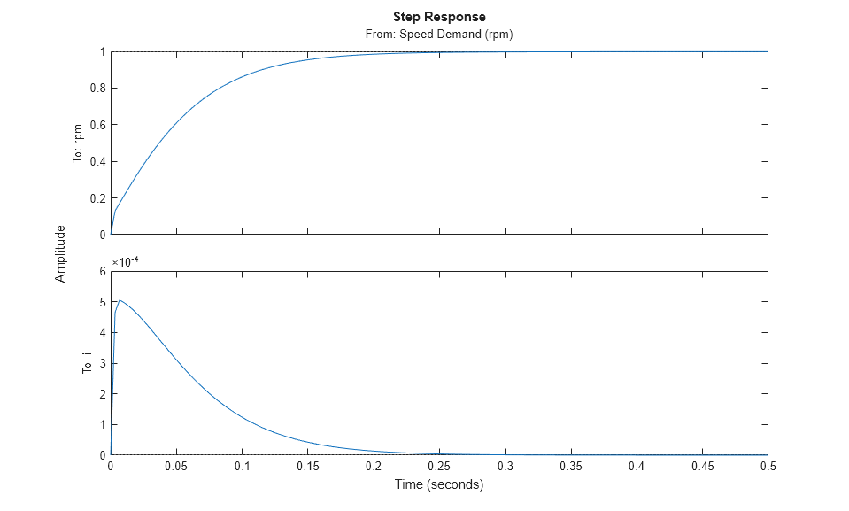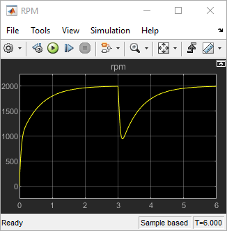 To validate this new design, push the new tuned gain values to the Simulink model and simulate the response to a 2000 rpm speed demand and 500 N load disturbance. The simulation results appear in Figure 5 and the current controller output is shown in Figure 6.