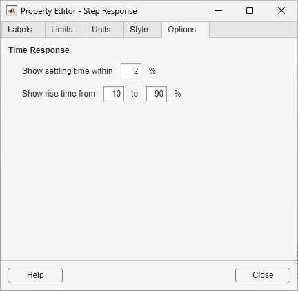 In general, you can change the following properties of response plots. Only the Labels and Limits tabs are available when using the Property Editor with Simulink® Design Optimization™ software.