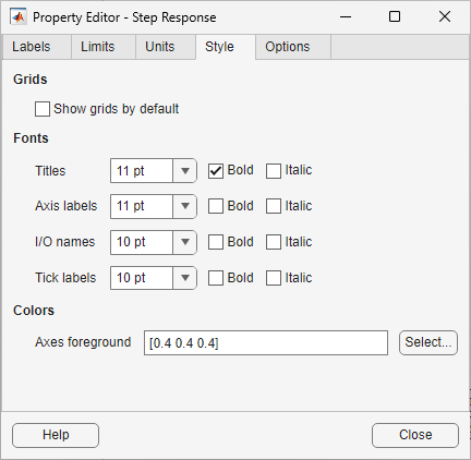Use the Style tab to toggle grid visibility and set font preferences and axes foreground colors for response plots.