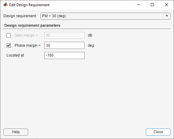 When editing a phase margin, gain margin, or closed-loop peak gain requirement, you can specify the display location as -180 ± k360 degrees, where k is an integer value.