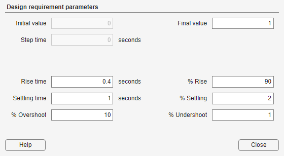 If you have Simulink® Design Optimization™ software installed, you can use response optimization techniques to find a compensator that meets your specified design requirements. For examples of optimization-based control design using design requirements, see Optimize LTI System to Meet Frequency-Domain Requirements (Simulink Design Optimization) and Design Optimization-Based PID Controller for Linearized Simulink Model (GUI) (Simulink Design Optimization).