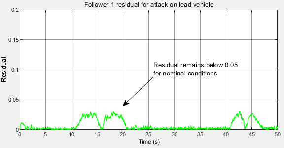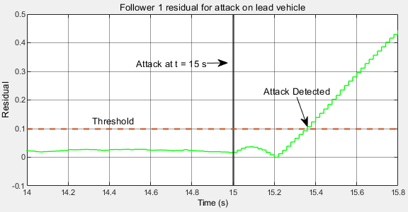 Based on the residual plot, choose the thresholds as 0.1 for detecting attacks on the lead vehicle. To allow the transients to settle and the Kalman filter predicted output to converge to the measured values, the model enables attack detection after 5 seconds.