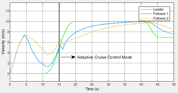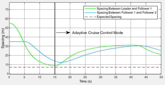 Malicious agents can attack and modify the transmitted information. This leads to undesired behavior that can range from collisions, isolating certain vehicles by increasing the spacing, and affecting the string stability of the platoon. This example shows how to detect and mitigate such attacks. Each vehicle in the platoon switches to adaptive cruise control using the position and velocity information from the sensors.
