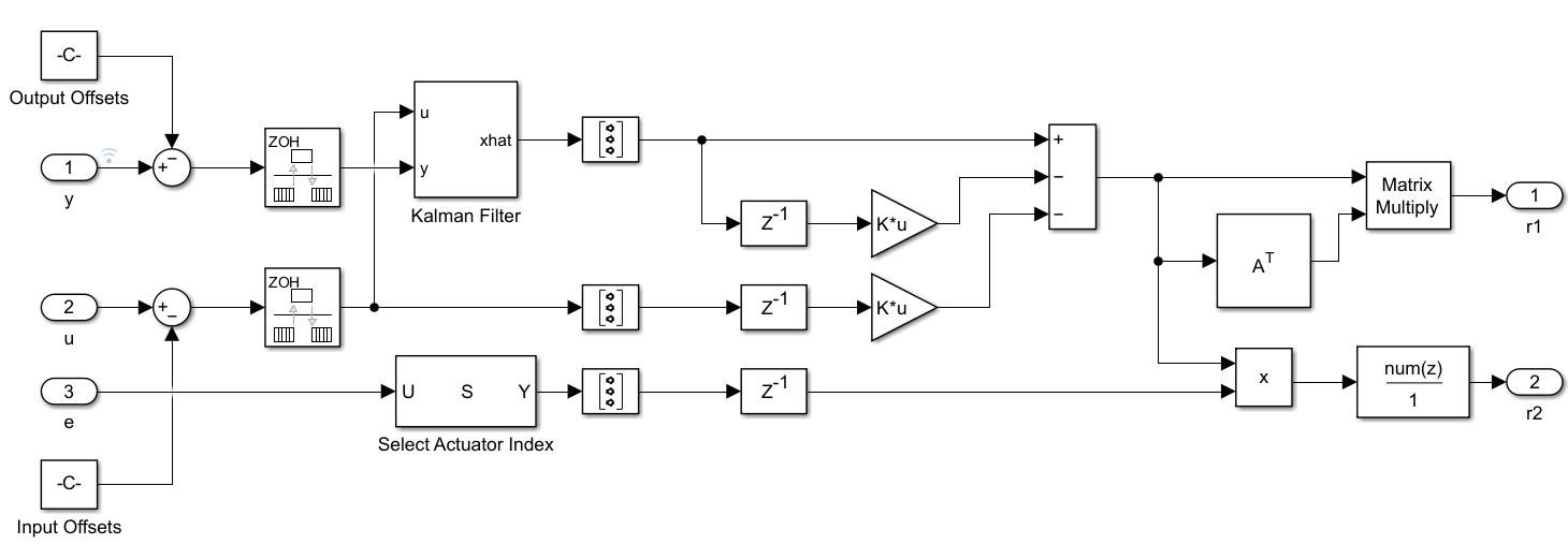 For partially observed systems, such as the DCmG used in this example, use a Kalman Filter block with the linearized model linsys to estimate the state vector. The offset information stored in info is subtracted from the input and output measurements before being used to generate the estimated states and the statistical test outputs r1 and r2.