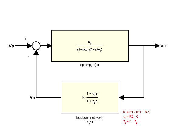 This example assumes the use of an uncompensated op amp with two poles (at frequencies w1,w2) and high dc gain (a0). Assuming this op amp is operated in its linear mode (not saturated), then its open-loop transfer function can be represented as a linear time-invariant (LTI) system, as shown above.