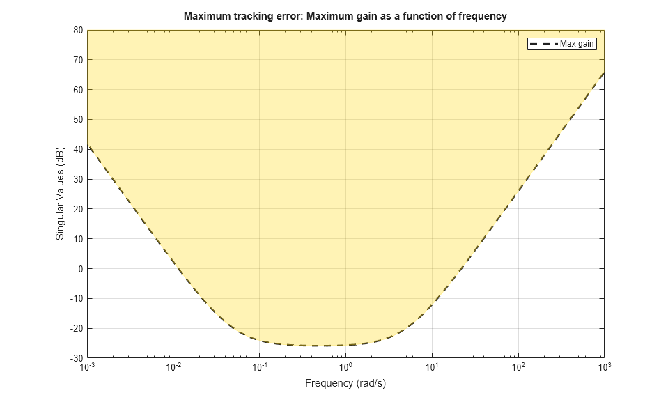 The TuningGoal.Gain constructor automatically turns the maximum error sketch into a smooth weighting function. Use viewGoal to graphically verify the desired error profile.