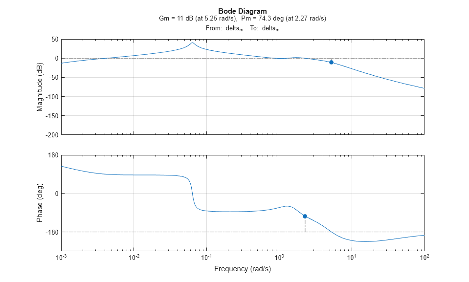 OL = getLoopTransfer(ST,'delta_m',-1); % negative-feedback loop transfer margin(OL); grid; xlim([1e-3,1e2]);