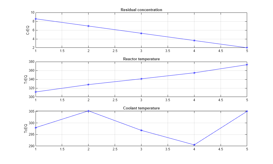 subplot(311), plot(CrEQ,'b-*'), grid, title('Residual concentration'), ylabel('CrEQ') subplot(312), plot(TrEQ,'b-*'), grid, title('Reactor temperature'), ylabel('TrEQ') subplot(313), plot(TcEQ,'b-*'), grid, title('Coolant temperature'), ylabel('TcEQ')