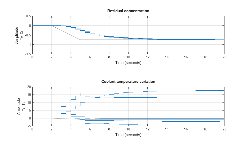 t = 0:Ts:20; uC = interp1([0 2 5 20],(-0.25)*[0 0 3 3],t); subplot(211), lsim(getIOTransfer(ST,'Cref','Cr'),uC) grid, set(gca,'ylim',[-1.5 0.5]), title('Residual concentration') subplot(212), lsim(getIOTransfer(ST,'Cref','Tc'),uC) grid, title('Coolant temperature variation')