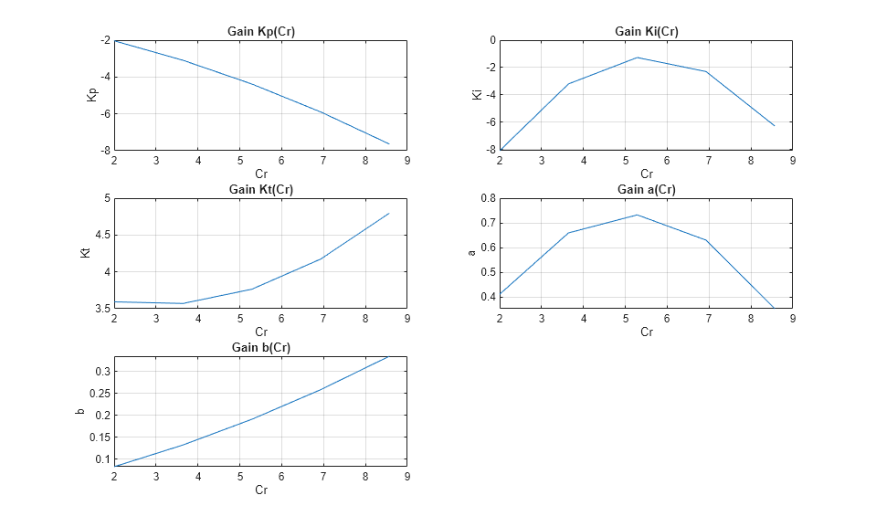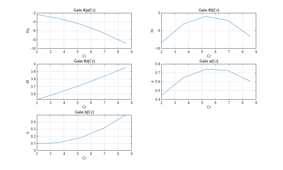 TuningGrid = struct('Cr',CrEQ); ShapeFcn = @(Cr) [Cr , Cr^2]; Kp = tunableSurface('Kp', 0, TuningGrid, ShapeFcn); Ki = tunableSurface('Ki', -2, TuningGrid, ShapeFcn); Kt = tunableSurface('Kt', 0, TuningGrid, ShapeFcn); a = tunableSurface('a', 0, TuningGrid, ShapeFcn); b = tunableSurface('b', 0, TuningGrid, ShapeFcn);