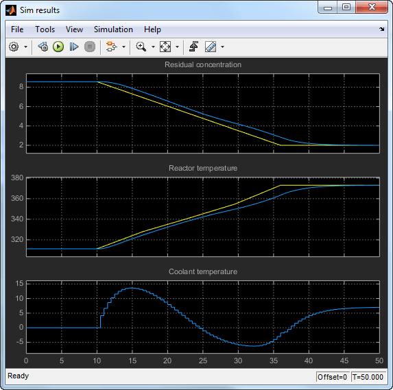 The process considered here is a continuous stirred tank reactor (CSTR) during transition from low to high conversion rate (high to low residual concentration). Because the chemical reaction is exothermic (produces heat), the reactor temperature must be controlled to prevent a thermal runaway. The control task is complicated by the fact that the process dynamics are nonlinear and transition from stable to unstable and back to stable as the conversion rate increases. The reactor dynamics are modeled in Simulink®. The controlled variables are the residual concentration Cr and the reactor temperature Tr, and the manipulated variable is the temperature Tc of the coolant circulating in the reactor's cooling jacket.