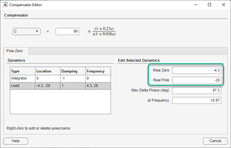 In the Compensator Editor dialog box, in the Dynamics section, click the Lead row.