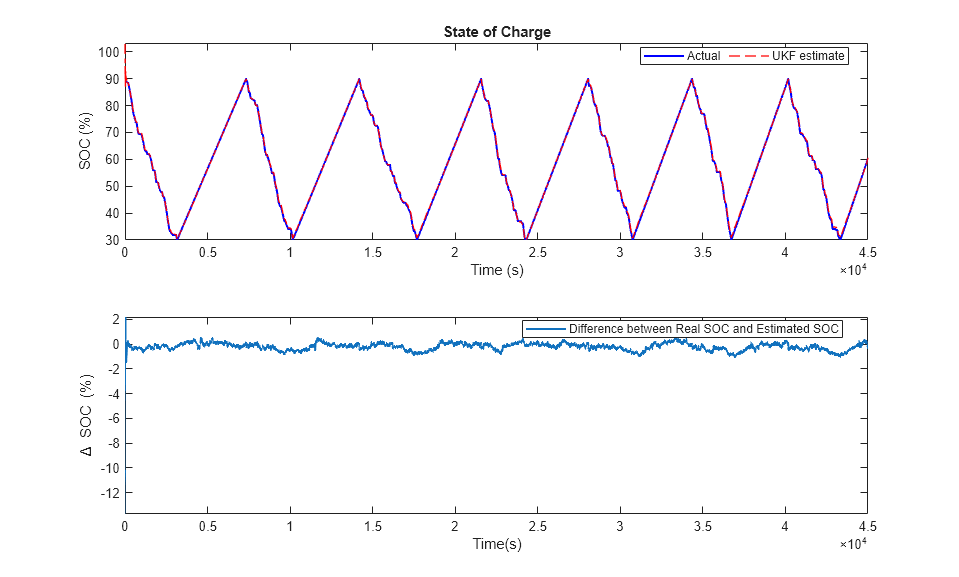 % Synchronize two time series [RealSOC, EstimatedSOC] = synchronize(RealSOC, EstimatedSOC, 'intersection'); figure; subplot(2,1,1) plot(100*RealSOC,'b','LineWidth',1.5); hold on plot(100*EstimatedSOC,'r--','LineWidth',1); title('State of Charge'); xlabel('Time (s)'); ylabel('SOC (%)'); legend('Actual','UKF estimate','Location','Best','Orientation','horizontal'); axis tight subplot(2,1,2) DiffSOC = 100*(RealSOC - EstimatedSOC); plot(DiffSOC.Time, DiffSOC.Data, 'LineWidth', 1.5); xlabel('Time(s)'); ylabel('\Delta SOC (%)','Interpreter','Tex'); legend('Difference between Real SOC and Estimated SOC','Location','Best') axis tight