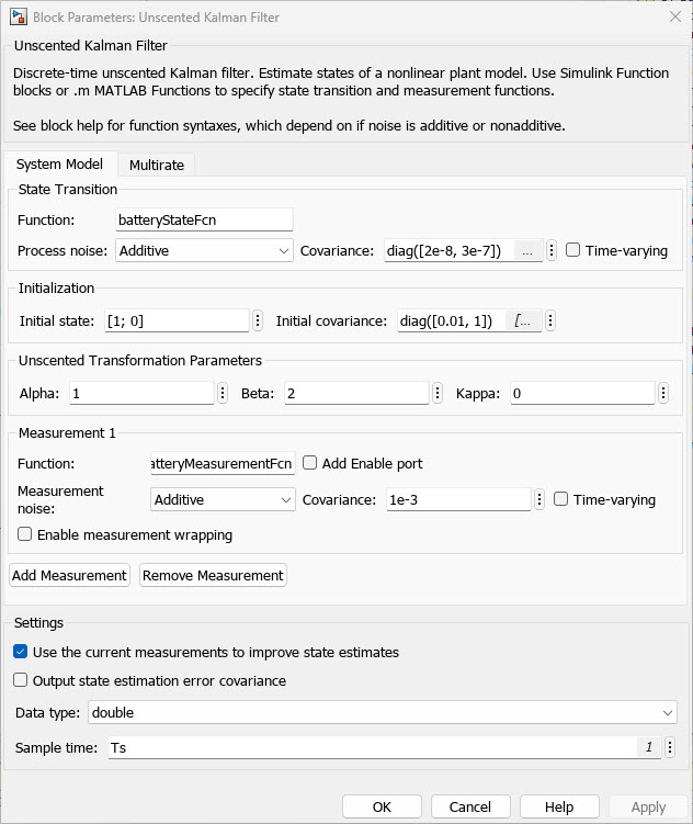This example shows how to use the Unscented Kalman Filter block to perform nonlinear state estimation for a lithium battery. In addition, steps to develop an event-based Kalman Filter for battery capacity estimation are illustrated. The newly estimated capacity is used to improve SOC estimation in the Unscented Kalman Filter.