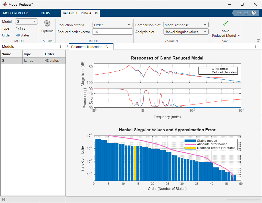 Model Reducer opens the Balanced Truncation tab and automatically generates a reduced-order model. The top plot compares the original and reduced model in the frequency domain. The bottom plot shows the energy contribution of each state, where the states are sorted from high energy to low energy. The order of the reduced model, 14, is highlighted in the bar chart. In the reduced model, all states with lower energy contribution than this one are discarded.