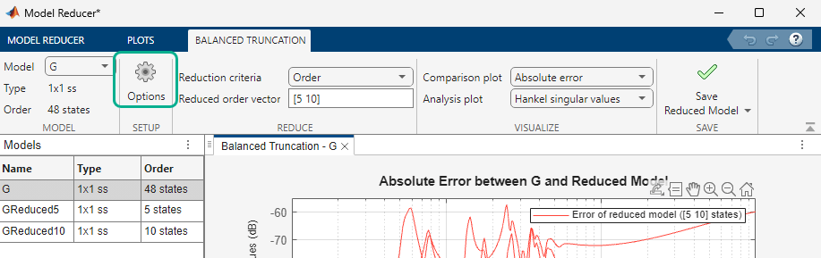 Model Reducer has three model reduction methods: Balanced Truncation, Modal Truncation, and Pole/Zero Simplification. For this example, click Balanced Truncation.