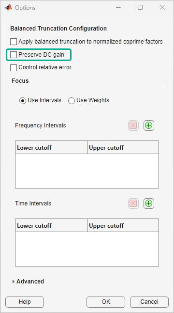By default, balanced truncation in Model Reducer preserves DC gain, matching the steady-state response of the original and reduced models. To change this setting, click Options.