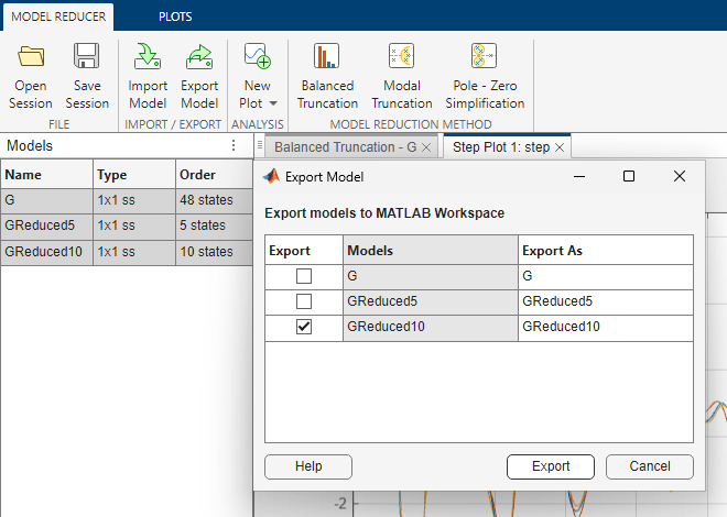 Comparison of the reduced and original models in the time and frequency domains shows that GReduced10 adequately captures the dynamics of interest. Export that model to the MATLAB® workspace for further analysis and design. In the Model Reducer tab, click Export Model. Clear the check boxes for G and Greduced5, and click Export to export Greduced10.